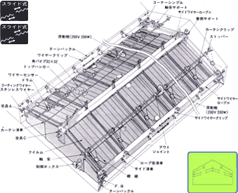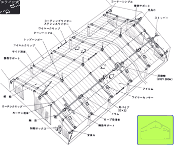 ■軸受固定部材やメタルフランジドラムにより、耐久性向上、コーティングワイヤーの重ね巻減少。 ■フィルム巻込み防止装置付滑車で安全。 ■柱に張力を分散、妻側サポート、軸受サポートにより、高い耐久性。 ■直径12.7mm先端パイプと新型カーテンクリップでスムーズな開閉。 ■耐候性の高い黒色樹脂部品を採用。 ■ATS装置により停止位置の設定が容易。 ■通常制御ボックスの他、ワイヤーセンサー、サーキットブレーカー付ボックスもあります。 ■自動化オプションが豊富。 ■三軸三層も可能。 |