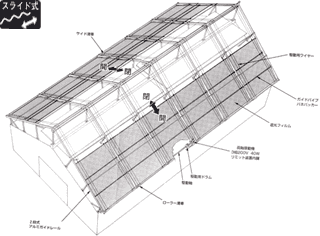 ■2段式ガイドレール(PET.P)により収納時の日影を最小にできます。 ■伸縮式ガイド滑車が、ガイドパイプのブレを吸収し開閉をスムーズにします。 ■閉動作はガイドパイプの固定された特種テープにより、フィルムには直に力がかからずフィルムに やさしい設計なっています。 ■遮光フィルムは各スパンごとに分割され、ガイドパイプに固定されているのいで、風通りがよく ばたつきがすくない。(巻き取り式のような押さえは不要です。) ■ガイドレールには、強度に優れ高級間もあるアルミ押出し材を採用、更にカーテンフィルムは きれいに展開、収納される美観をそこねません。 |