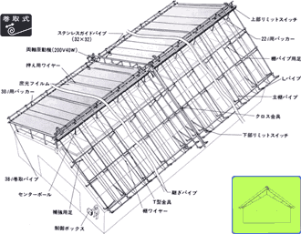 ■カーテン方式は豊富な実績のある、巻取式カーテンを採用しました。 ■屋根上設置のため、原動機、リミットスイッチ、配線などはすべて防水対策がしてあります。 ■棚パイプには補強足を多様し、台風にも安心です。 ■オートコントローラー(オプション)を使用すると自動化・省力化が手軽にできます。 |